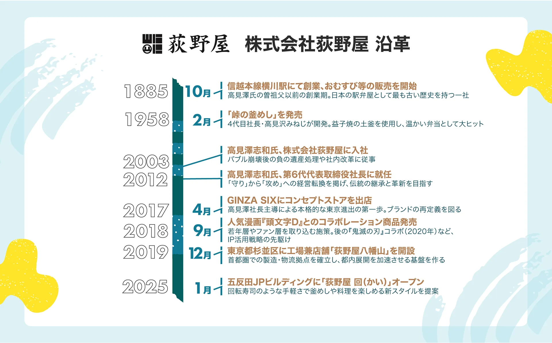 かつて難所と呼ばれた碓氷峠の麓で、140年にわたり旅人の腹と心を満たしてきた。1958年に看板商品の峠の釜めしを筆頭に、伝統の味を守りながら、アニメコラボや都心への新業態出店など、矢継ぎ早に革新を仕掛けている。単なる事業拡大ではなく、峠の釜めしを旅の記憶装置へと昇華させる高見澤氏の壮大なブランド戦略について伺った。