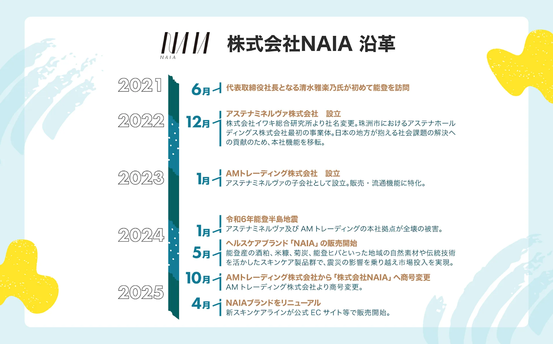 そう語るのは、株式会社NAIAで代表を務める清水 雅楽乃さん。アステナホールディングス株式会社の管理本部副部長として、グループ全体の業務効率化に従事していたが、2021年、石川県珠洲市への本社機能移転時に新規事業推進室へ。現在は能登地方の産業と連携しながら、スキンケア製品を製造・販売している。
