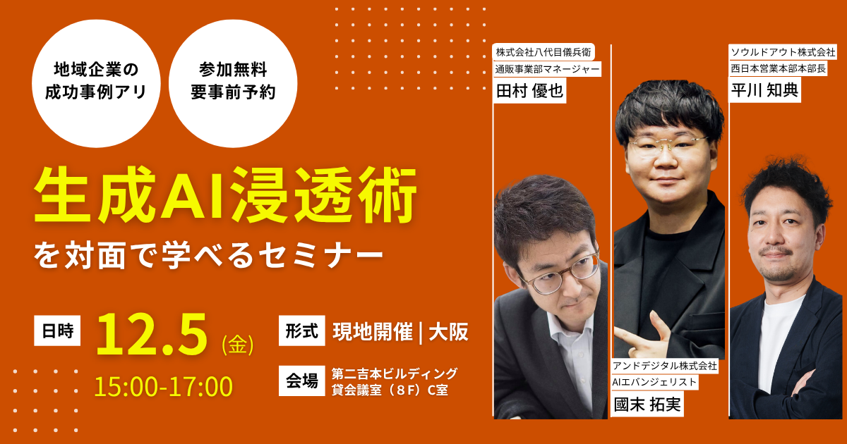 アンドデジタル株式会社(本社:東京都文京区 代表取締役:津田 翔平)とソウルドアウト株式会社は、現在進行中の「ローカル×AI 中堅・中小企業のための生成AIセミナー全国キャラバン」の3カ所目となるセミナーを、2025年12月5日(金)に大阪にて開催いたします。